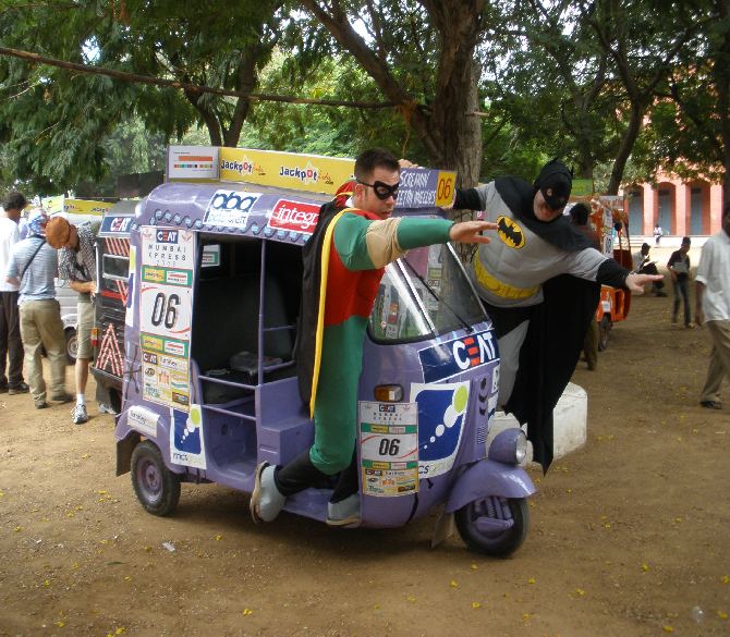 Participants placed the final decorative touches on outrageously designed autorickshaws, from the Disco bottle hanging from Compact Pussycat’s rickshaw, to the bell pull used as a tail and male blow-up doll to complete team Nip ‘N’ Tuk’s autorickshaw that had been transformed into a pink elephant. Participants got their first taste of the local media crews that follow the event, posing in costumes that ranged from pirates, to superheroes and hippies.