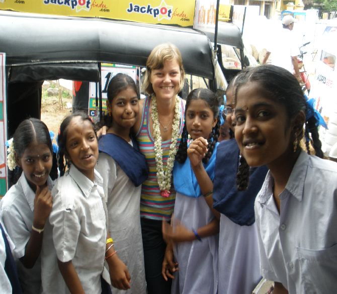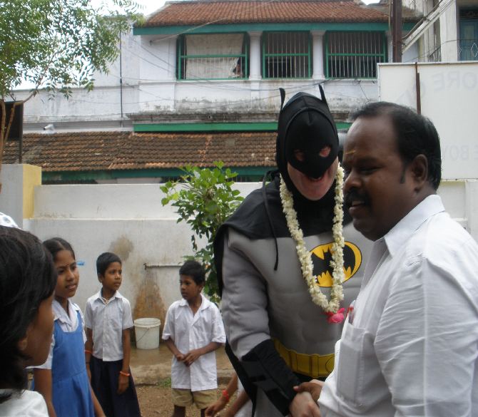 Once there, teams in Batman and Robin costumes were swarmed by thrilled school children. All of the participants and organizers were welcomed with beautiful flower garlands and asked to shake hands and give autographs and pictures with boys and girls who loved the colorful autos and the attention. Participants surrounded by kids requesting autographs and being photographed by local media were overwhelmed by feeling like celebrities, but managed to really enjoy touring classrooms and learning more about Sri Ramakrishna Middle School, Kosapet, Vellore.
