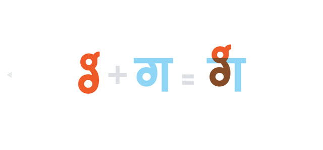 Hindi is written in the Devanagri script, which has many more characters than the English alphabet. This font, then, cannot teach you how to read words as they are spelt in Hindi, but its aim is to demystify individual letters in its script and make India more approachable. Despite the superficial distinctiveness of English and Hindi, the two borrow from the same phonetic pool – they both belong to the Indo-European group of languages. This font design playfully highlights these commonalities.