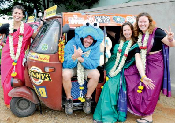 Pia Brasher, 31, and Alisha Hughes, 29, of Australia, who share an autorickshaw with Ruth Brown, 30, of the UK are teachers from Dubai. They hope to make use of the journey to campaign for educating the people of rural India. Having enjoyed their journey so far, the women are grateful for the friendly reception they have received everywhere.