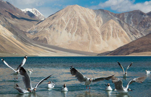 Pangong Tso Lake is a high altitude lake in the Himalayas. Situated at a height of about 4,350 m (14,270 ft), it is 134 km (83 mi) long and extends from India to Tibet. The ever changing colors of the lake are due to the play of light, wind and the clouds.