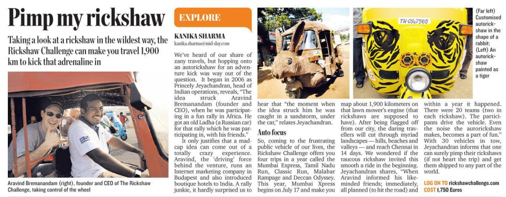 20JunadminAuto rickshaw, India, Mumbai Xpress, pimp my rickshaw, pimped rickshaw, Rickshaw Challenge, three wheeler, three-wheeled vehicle, Tuk TuksAuto rickshaw, Midday Newspaper, pimp my rickshaw, rickshaw, rickshaw challenge, tuk-tuk0 Pimp My Auto Rickshaw A Midday Newspaper piece about the Rickshaw Challenge. Click on the article below to view/download.