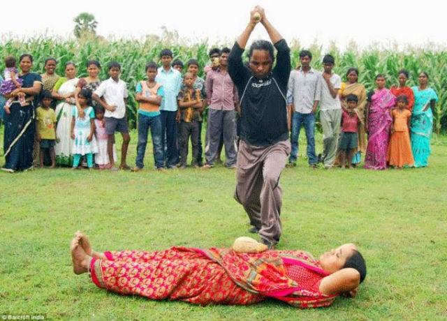 BARMY Bhramaramba Budati let’s her husband smash and slice coconuts on her body as one of India’s most impressive stunt women. The 39-year-old housewife and mother-of-two, has gained attention in her native Andhra Pradesh region thanks to her daredevil acts of strength – including smashing tiles, tube lights and blocks of ice across her body. Alongside husband Balashankar Budati, 40, the pair tour their home state in southern India – performing in front of amazed onlookers.